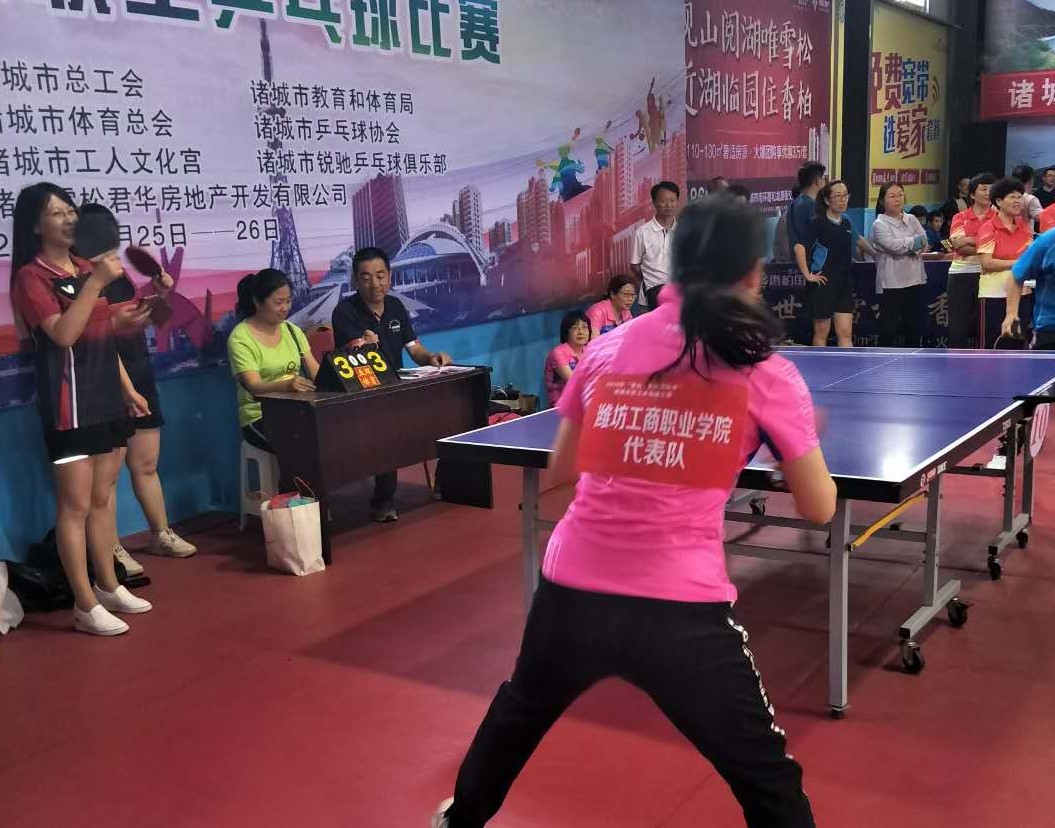 5月25日至26日,由诸城市总工会、教育和体育局、体育总会、乒乓球协会联合举办的2019”雪松·香柏杯“诸城市职工乒乓球比赛在锐驰乒乓球俱乐部隆重举行。来自全市59支男、女乒乓球球队共计300多名运动员参加了比赛。比赛设男子团体、女子团体、男子单打和女子单打4个比赛项目。我院组成了8人的乒乓球代表队,在王娟、左安池二位老师的带领下参加了大赛全部四个项目的比赛。