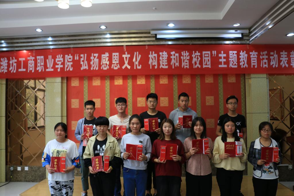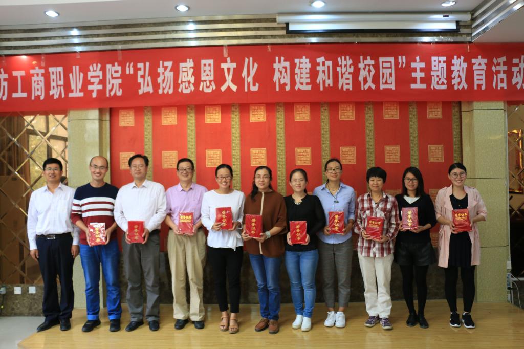 据悉,为加强我院教职工思想道德建设,构建感恩文化长效机制,我院专门制定了《潍坊工商职业学院关于开展“弘扬感恩文化•共建和谐校园”活动的通知》【潍工职院发〔2018〕15号文】,为贯彻通知精神,2018年5月18日至2018年9月28日,历时四个多月,在全院师生范围内开展了感恩主题征文、感恩事迹及感恩主题演讲比赛等系列感恩主题教育活动。本次主题教育活动,极大地激发了广大师生的参与热情,为今后有更多的师生参与到此项活动中打下了良好的基础,感恩文化的传承与发扬必将在我院结出更加丰硕的成果。
