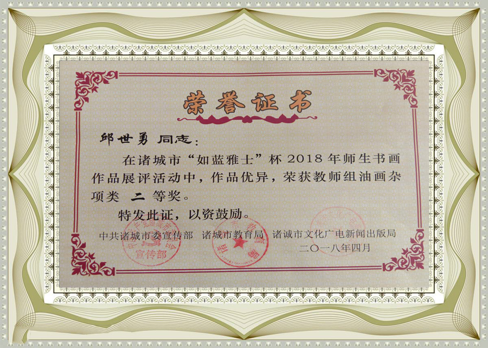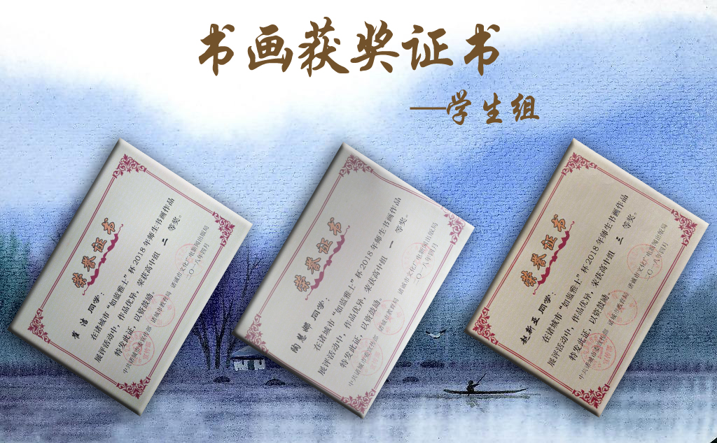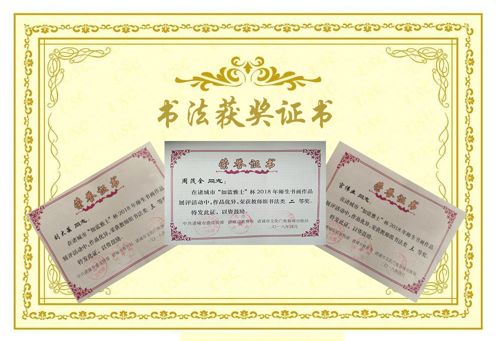 为认真贯彻落实党的十九大精神,推进我院文化艺术教育向更高层次发展,充分展示广大师生的书法、美术水平和审美素养,我院师生积极参加了诸城市教育局于2018年1月举办的“如蓝雅士”杯2018年元旦师生书画作品展评活动,取得了优异成绩,有八名教师和三名学生获奖。其中战志芳老师获得教师组国画类一等奖、王永芝教师获得教师组国画类二等奖、张栋栋和王桂珍二位老师都获得了教师组国画类三等奖,邱世勇教师获得教师组油画类二等奖,周茂全老师获得教师组书法类二等奖、宫伟业和刘大芸二位老师都获得了教师组书法类三等奖,陶慧娜、崔洁、赵新亚三位同学分获高中组一、二、三等奖,邱世勇老师还荣获了本次活动的诸城市优秀辅导教师奖。