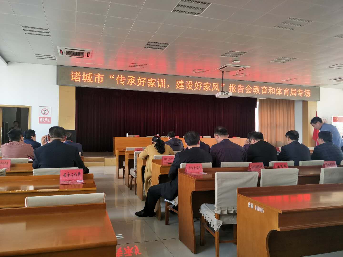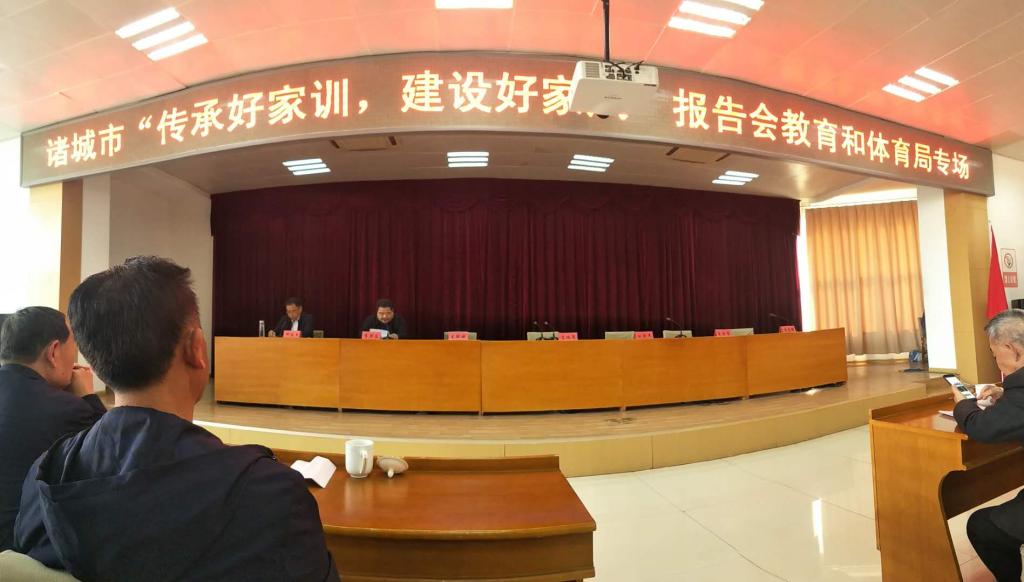 诸城市“传承好家训,建设好家风”报告会教育和体育局专场于2019年4月19日在教育和体育局四楼会议室召开,诸城市关工委相关领导,以及各镇园(园区)中心学校校长、初中校长、驻地小学校长、中心幼儿园园长、社区分院院长,市直各学校校长、关工委专职副主任,局机关全体人员参加了报告会。我院关工委办公室副主任王娟老师参加了会议。