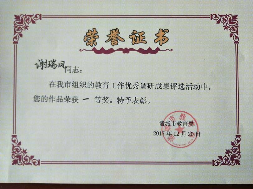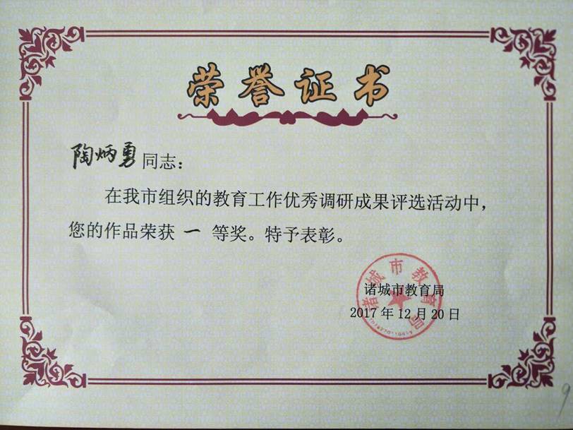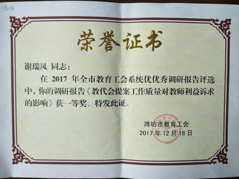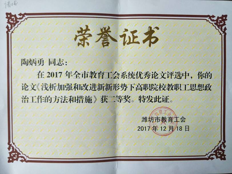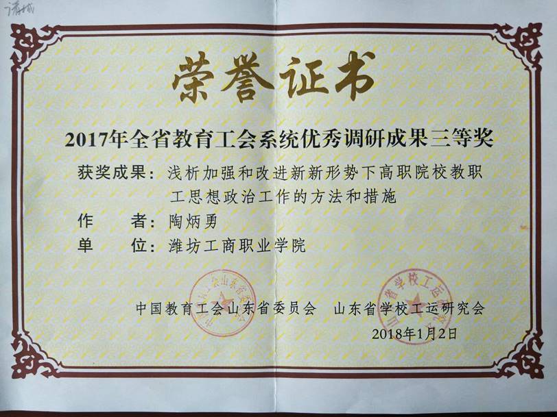 为落实潍坊市教育工会转发的《关于开展2017年全省教育工会系统优秀调研成果评选活动的通知》(潍教工[2017]11号)精神,根据诸城市教育工会要求,于2017年10月28日,将我院推选的一个调研报告和一篇论文纸质版和电子版上报了诸城教育工会,在诸城教育工会印发的表彰通知中,我院推选的调研报告和论文均获一等奖,在潍坊教育工会的表彰中分获一、二等奖,在全省教育工会系统优秀调研成果评比中荣获三等奖。谢瑞凤获奖的调研报告题目是:教代会提案工作质量对教师利益诉求的影响——基于潍坊工商职业学院提案工作实践的调研;陶炳勇获奖论文题目是:浅析加强和改进新新形势下高职院校教职工思想政治工作的方法和措施。